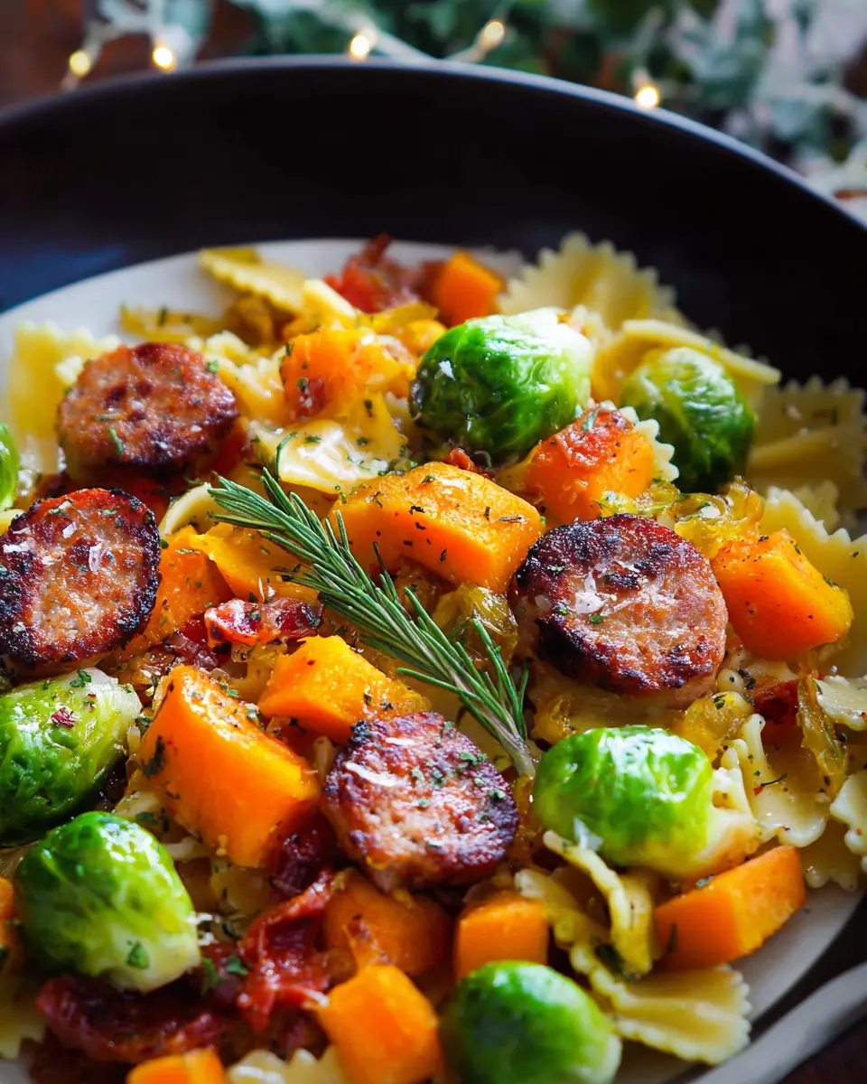 Autumn Dinner with Sausage, Pasta, Brussels Sprouts and Butternut Squash