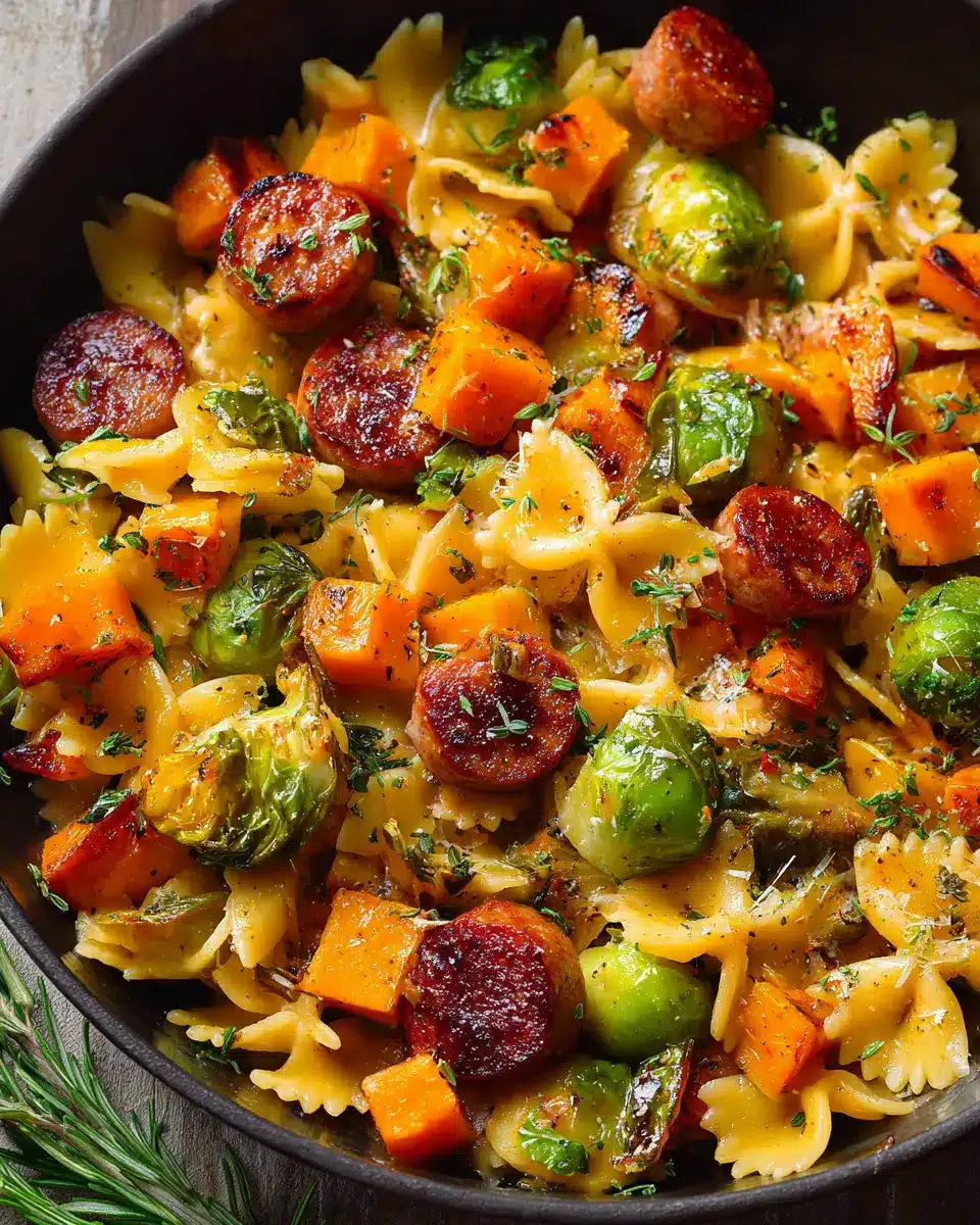Now, it’s time for the grand finale! Add the drained pasta to your skillet, coating it thoroughly in the garlic butter sauce. Then, return the sausage to the mix, along with your deliciously roasted butternut squash and Brussels sprouts. A sprinkle of salt, pepper, and a touch of smoked paprika will elevate the flavors even more.