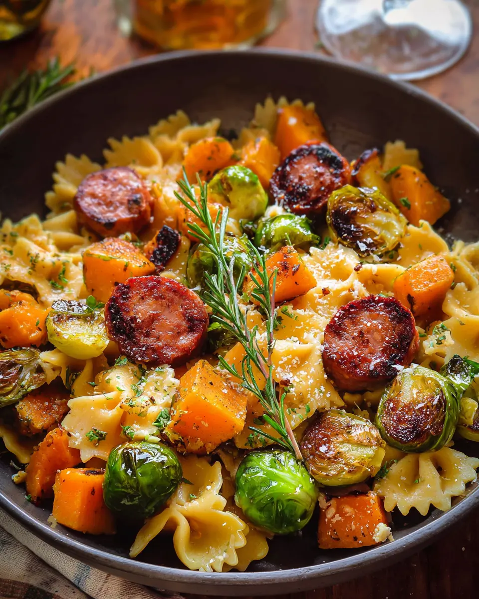The actual cooking will take around 40 minutes. This includes roasting your butternut squash and Brussels sprouts, cooking the pasta, and sautéing the sausage to infuse those rich flavors.