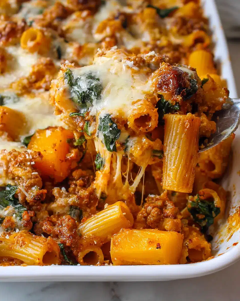 Baked Butternut Squash, Sausage and Spinach Pasta