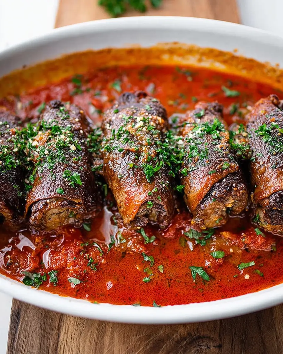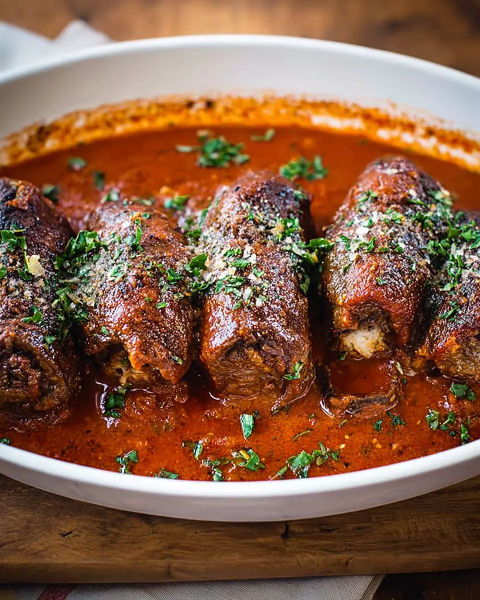 In a large pan, heat two tablespoons of olive oil over medium-high heat. Once the oil is lightly smoking, add the beef roulades, searing them until they are golden brown (around 2–3 minutes per side). After searing, pour in some broth or a suitable alternative to wine, allowing it to cook for a few minutes to deglaze the pan. Finally, add the prepared tomato sauce, cover, and let it braise on low heat for about an hour. This slow cooking is key to achieving that melt-in-your-mouth texture.