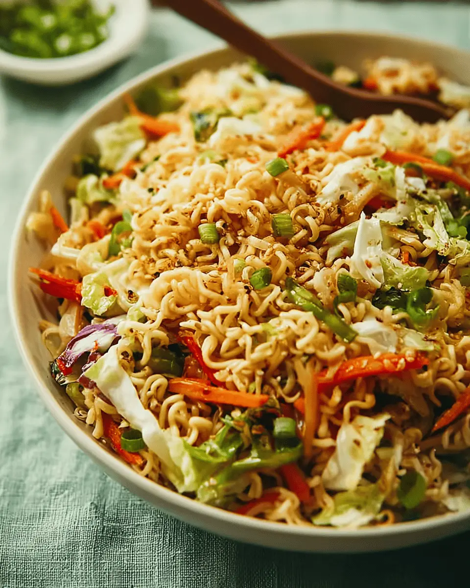 Want to elevate your ramen noodle salad presentation? Try serving it in individual mason jars for a picnic or potluck. Layer the ingredients starting with the dressing on the bottom, followed by the coleslaw mix, and finish with the crispy noodles and nuts on top. When it’s time to eat, simply shake the jar! You can also add some grilled vegetables or a sprinkle of sesame seeds for an extra pop of flavor and color. For more serving ideas, check out food blogs or Pinterest for inspiration!