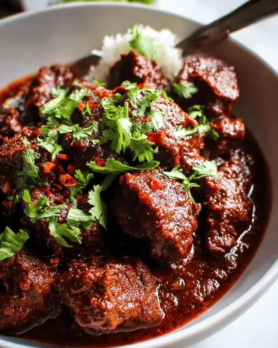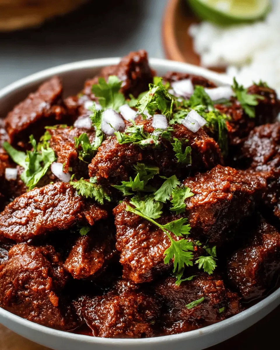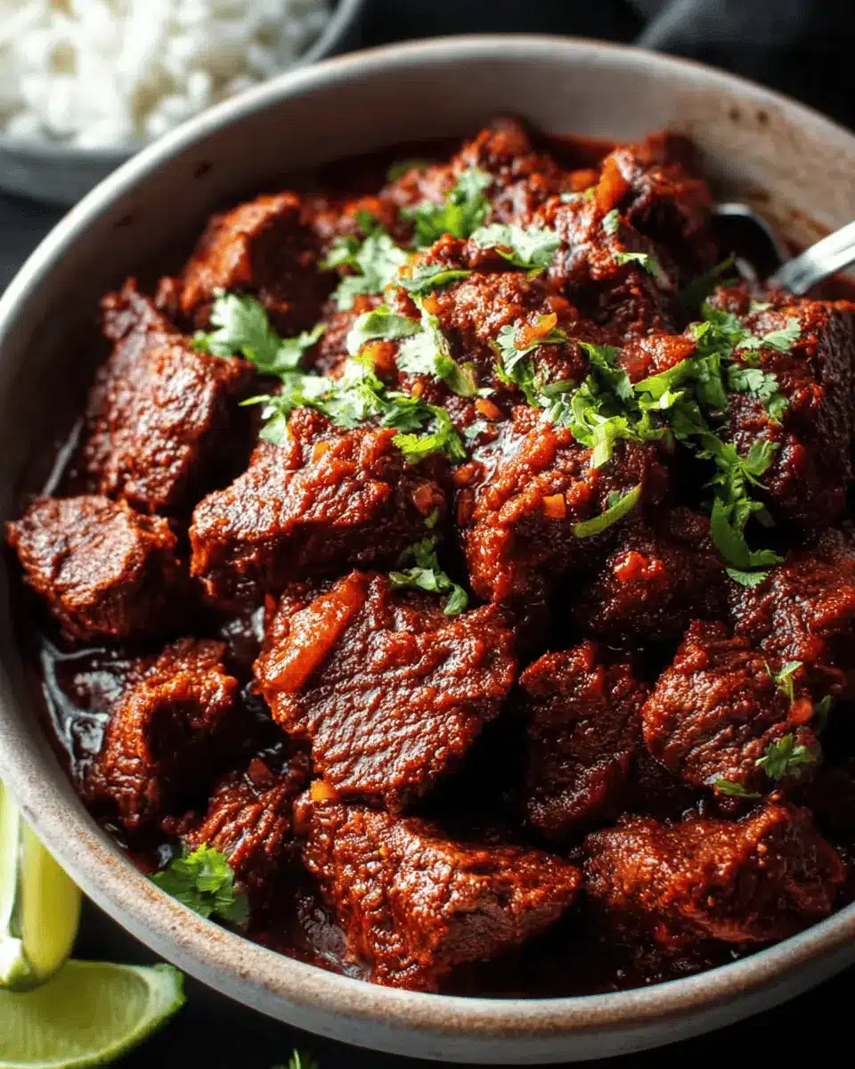 Once prepped, dive into the cooking phase, which takes approximately 2 hours and 35 minutes. This slow cooking allows the beef to become incredibly tender while absorbing all those bold flavors from the chile sauce.