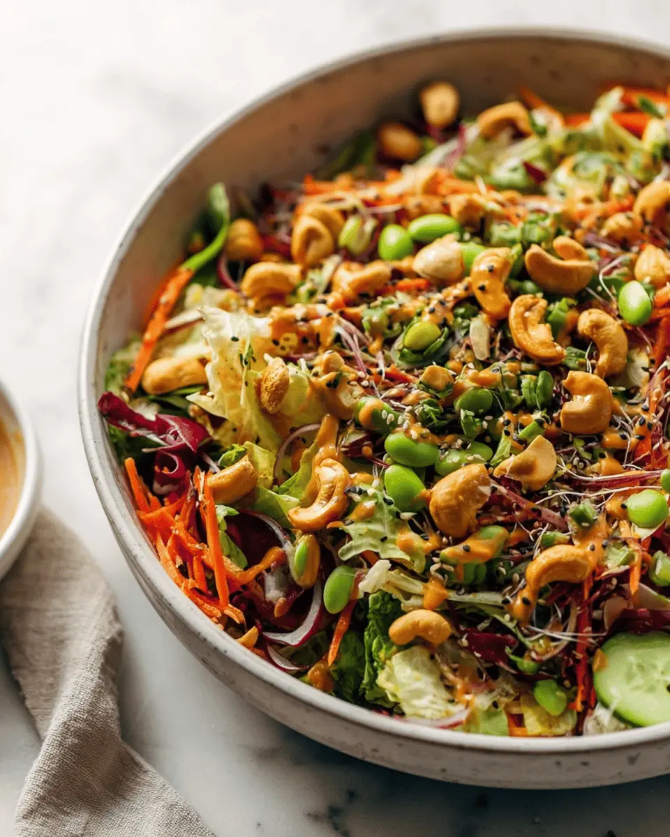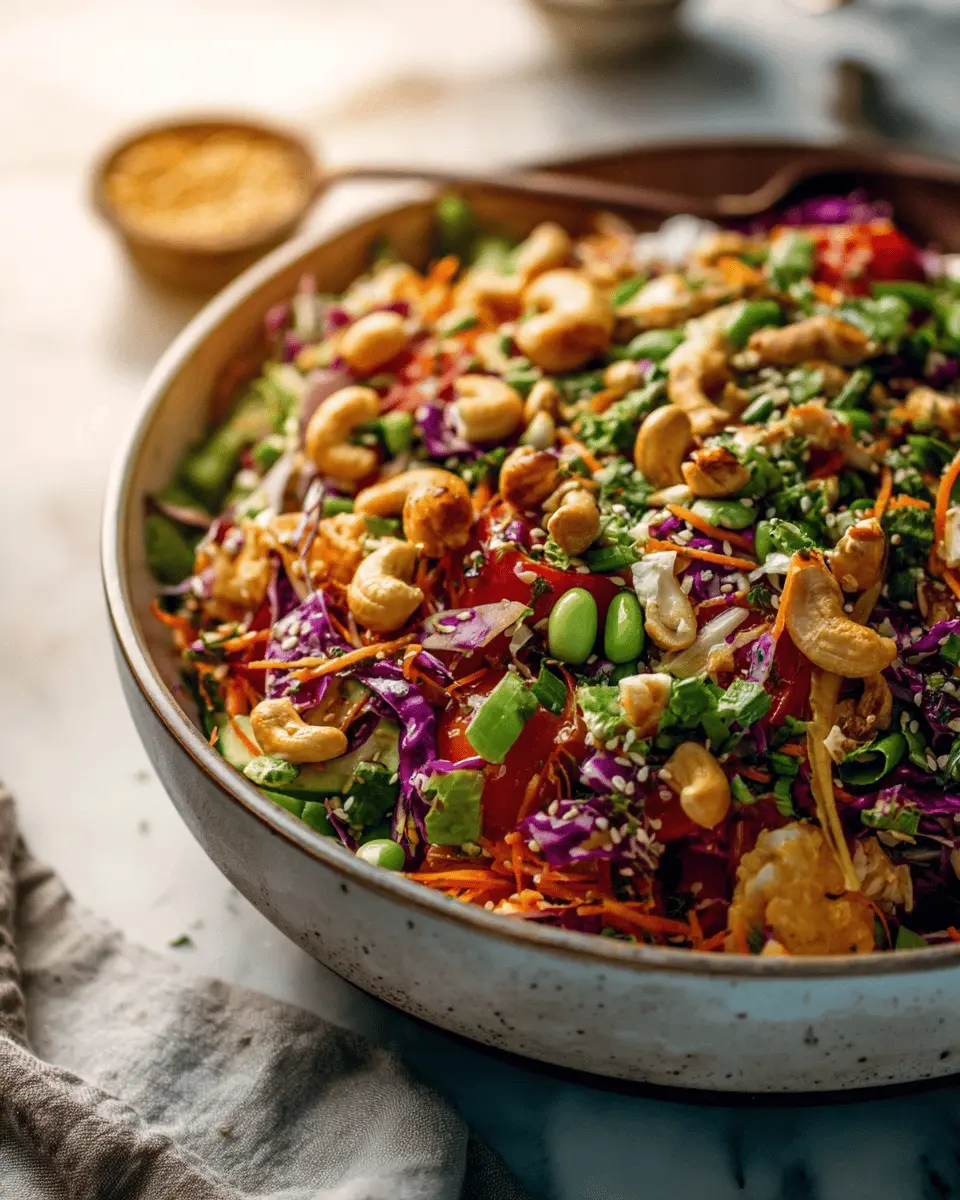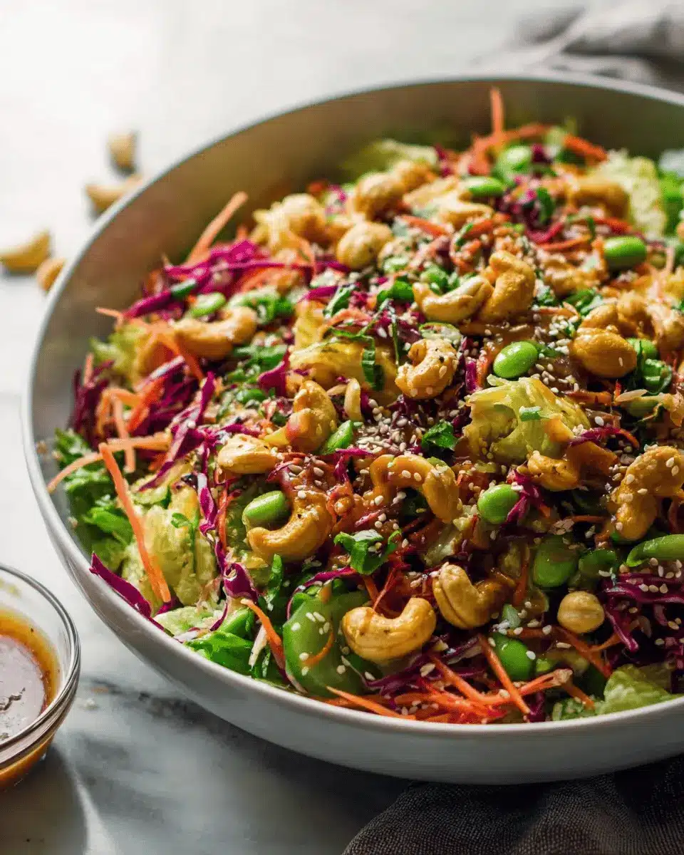 What sets this salad apart is its delightful crunch! Incorporate 2 cups of cooked edamame for a protein boost, along with 1 to 2 cups of roasted cashews to give it that essential crunchiness. For an optional twist, toss in 2 cups of crunchy chow mein noodles—they add an irresistible textural contrast that you won’t want to miss.