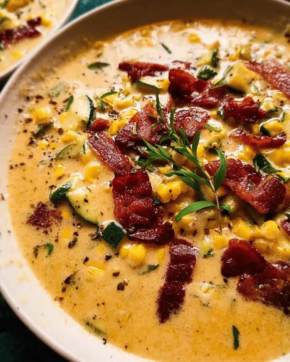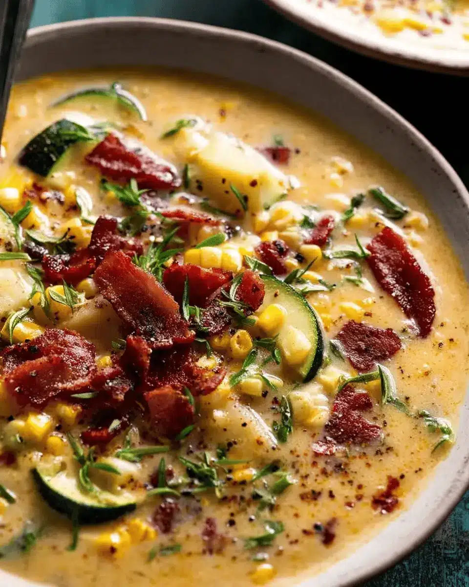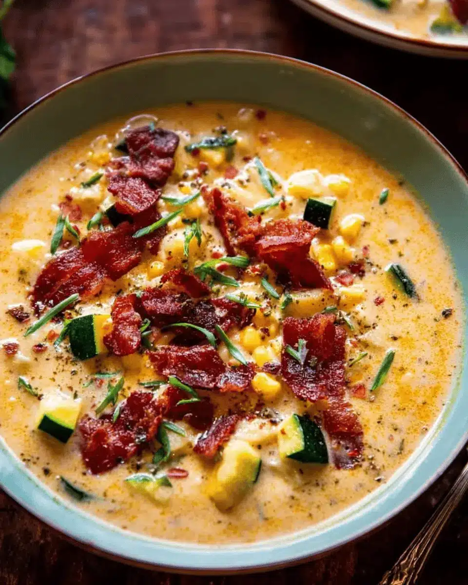 Creamy Corn, Zucchini, and Bacon Chowder.