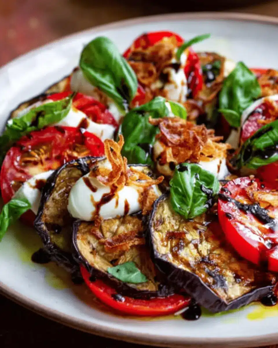 Absolutely! The eggplant caprese salad can be prepped a few hours in advance. Just layer the cooked and cooled eggplant with the mozzarella, tomatoes, and basil. Drizzle the aged balsamic just before serving to keep everything fresh and lively. If you're serving this for a gathering, you can also roast the eggplant ahead and store it in the fridge.