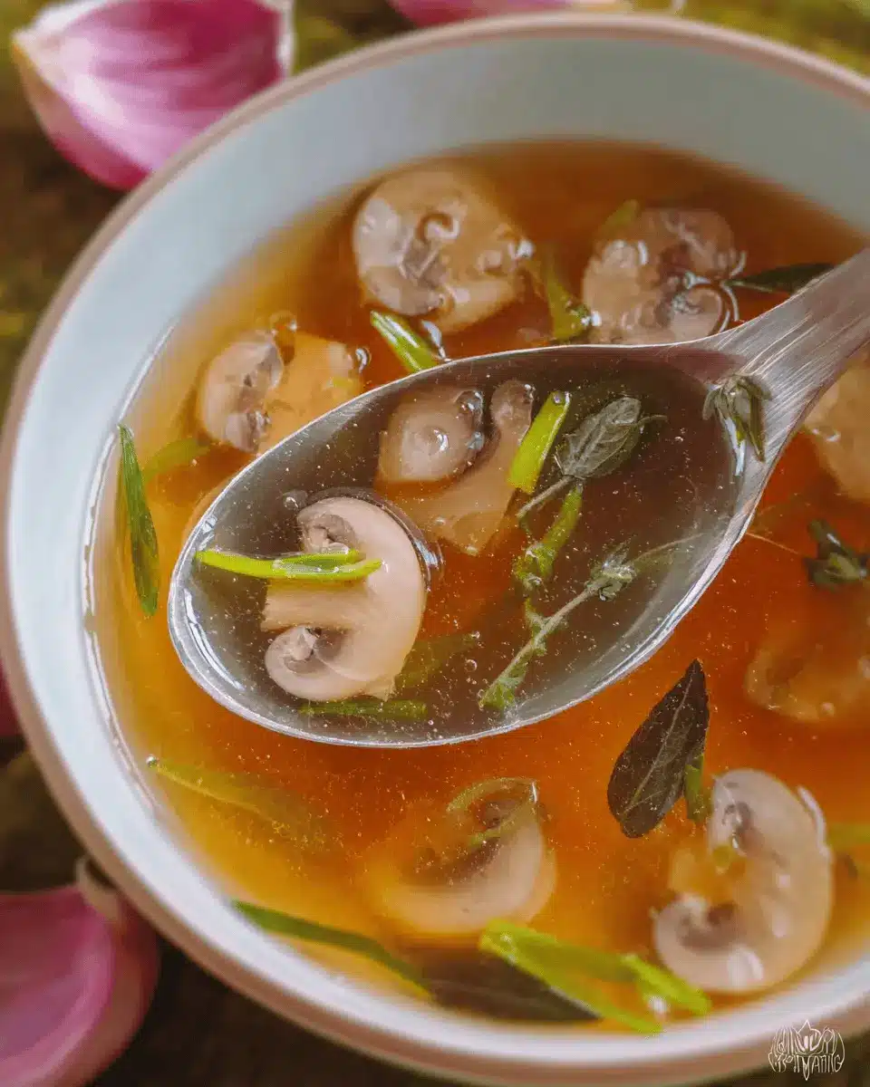 To serve your Japanese Clear Soup, divide the hot broth between four individual bowls. Garnish each bowl with fresh sliced scallions and thinly sliced button mushrooms. These final additions provide a beautiful contrast in texture and flavor, elevating your soup from simple to spectacular!