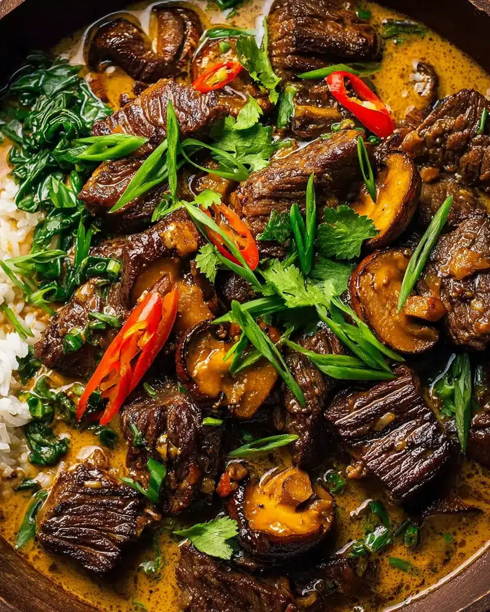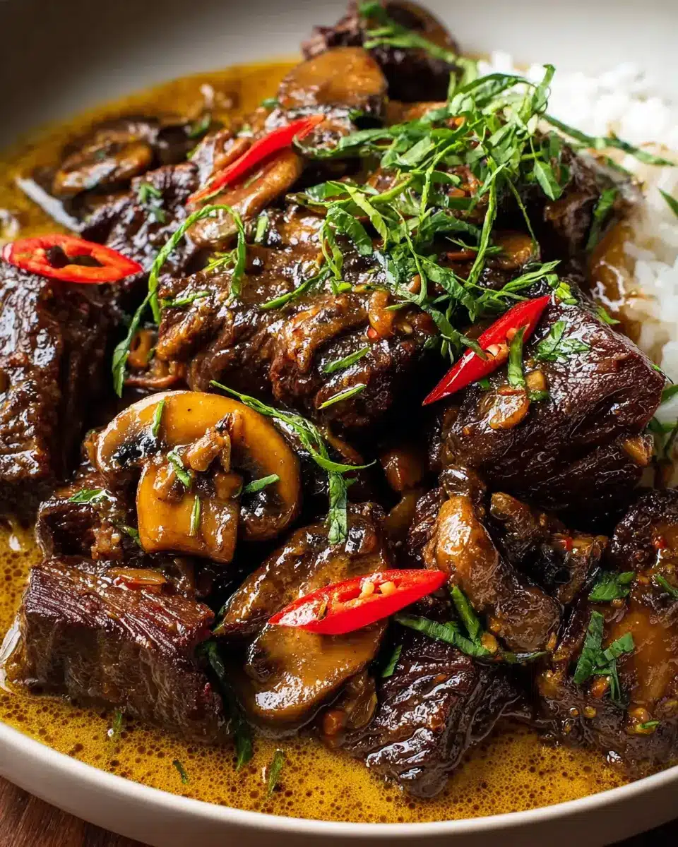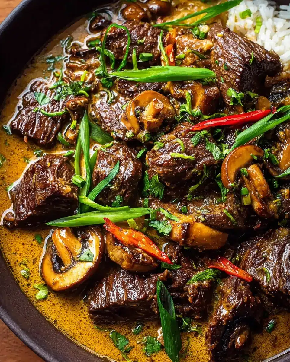 - Spoon the tender beef, mushrooms, and creamy coconut sauce over steamed rice. Garnish with fresh cilantro, a squeeze of lime juice, and a drizzle of chili oil or sprinkle of chili flakes for a hint of heat.