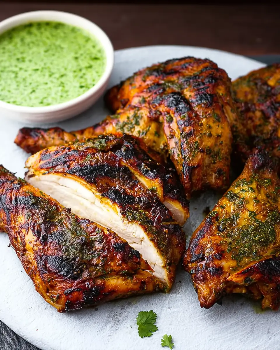 Let the grilled chicken rest for five to ten minutes. This resting period is essential, as it allows juices to redistribute throughout. Now, carve it up and serve with that mouthwatering green sauce on the side. Your guests will be impressed by the vibrant flavors and aroma of your Peruvian-Style Grilled Chicken. Enjoy every flavorful bite!