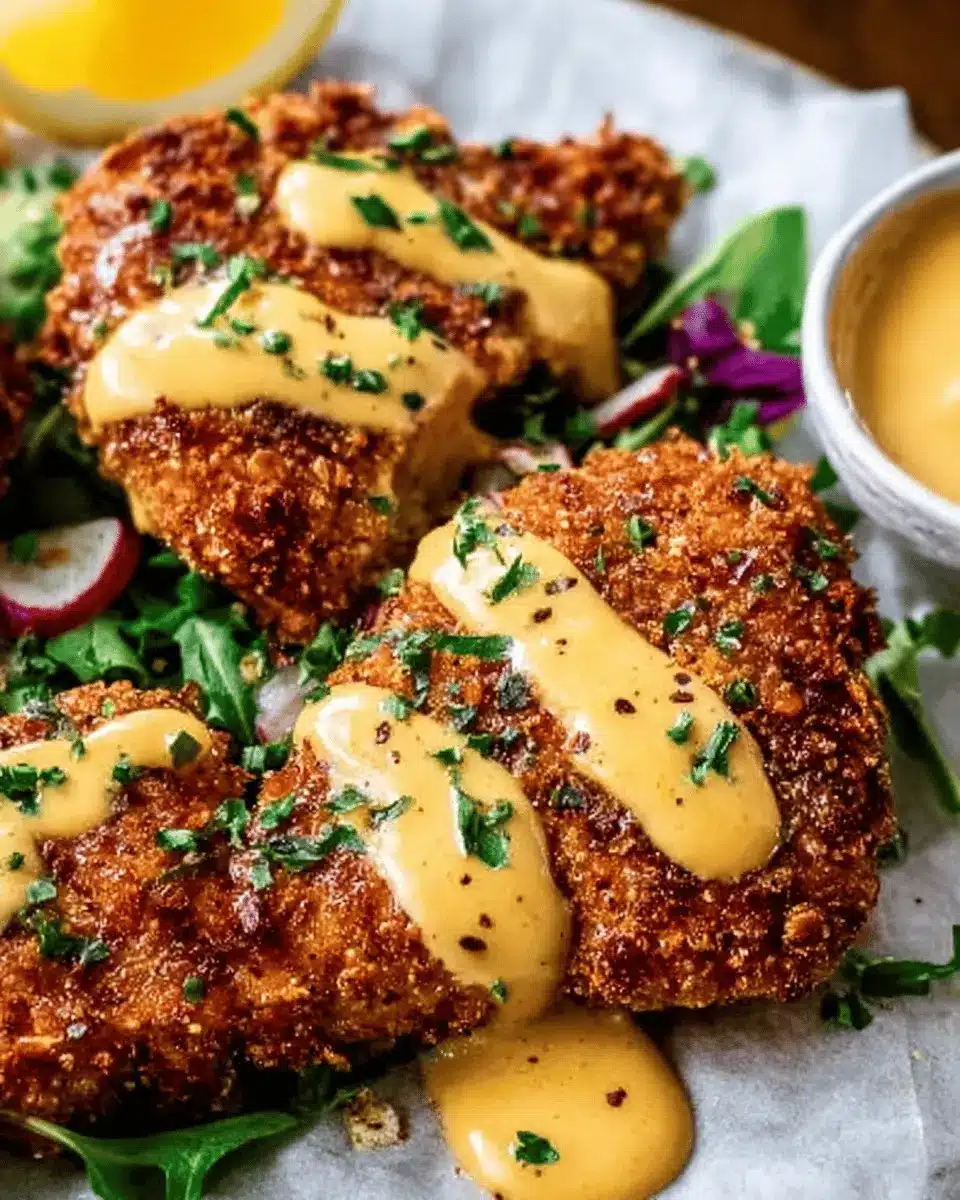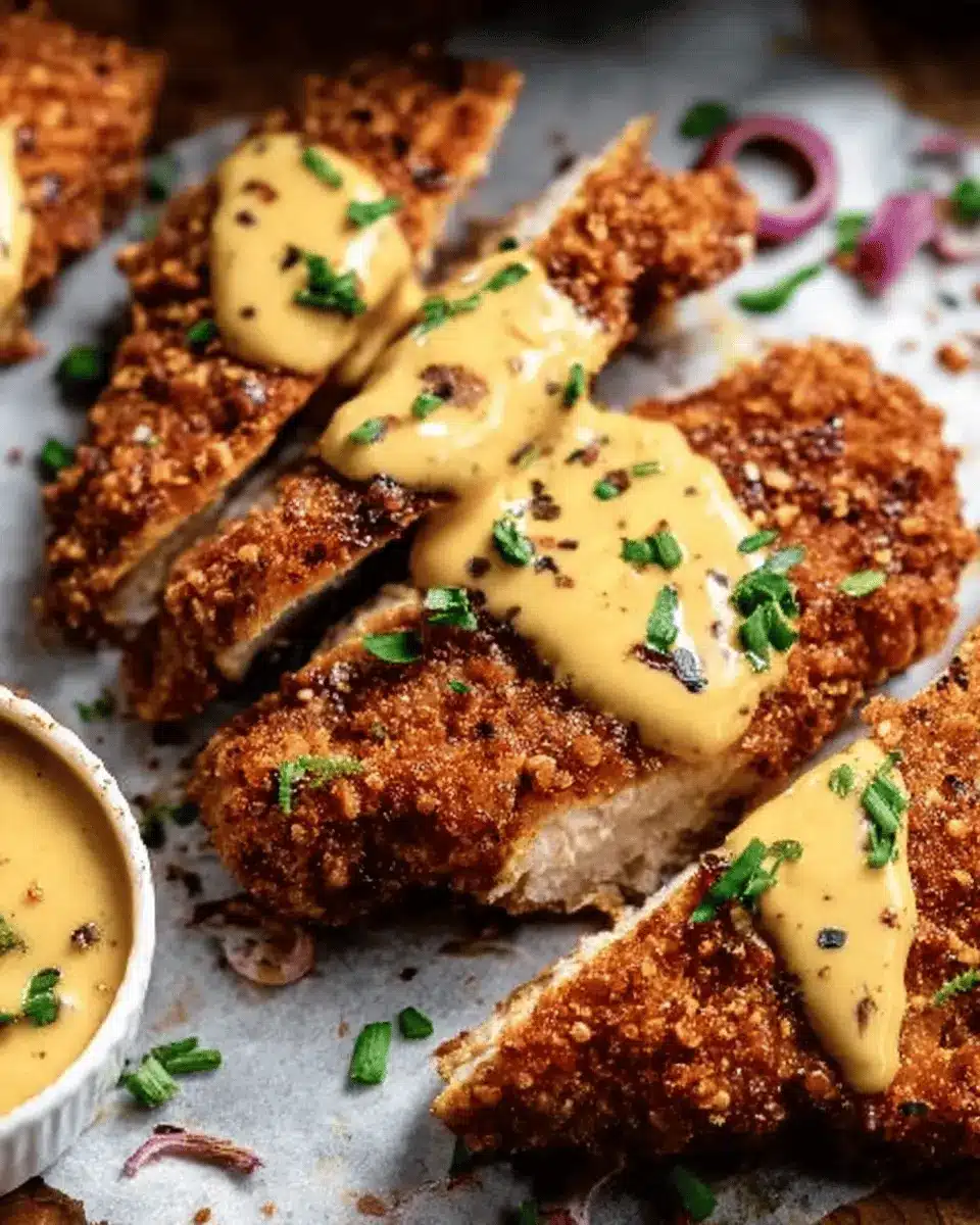 To serve, place those deliciously crispy chicken breasts on a plate and generously drizzle the cheddar-mustard sauce over each piece. Garnish with a sprinkle of chopped flat leaf parsley and a touch of finely chopped red onion for some color and freshness.