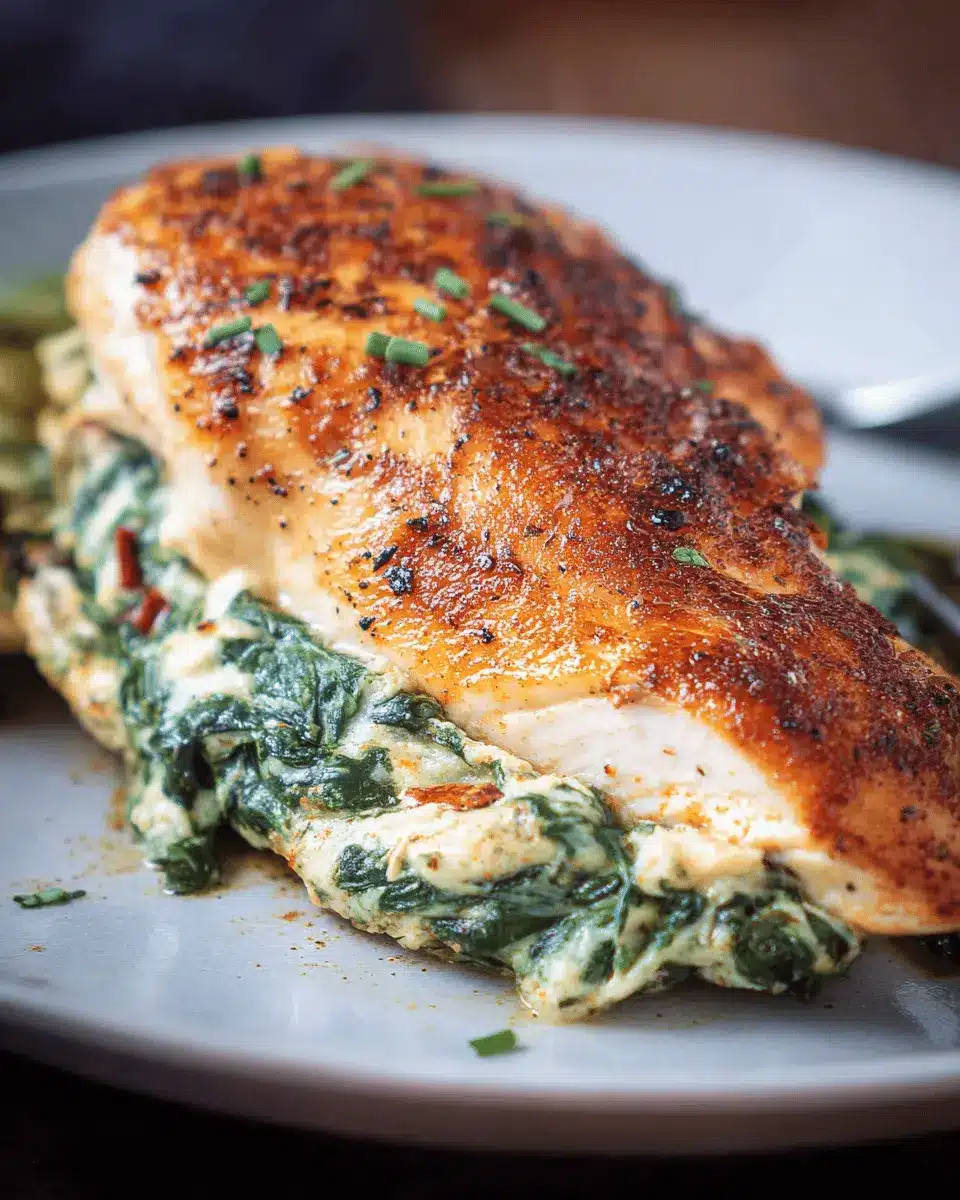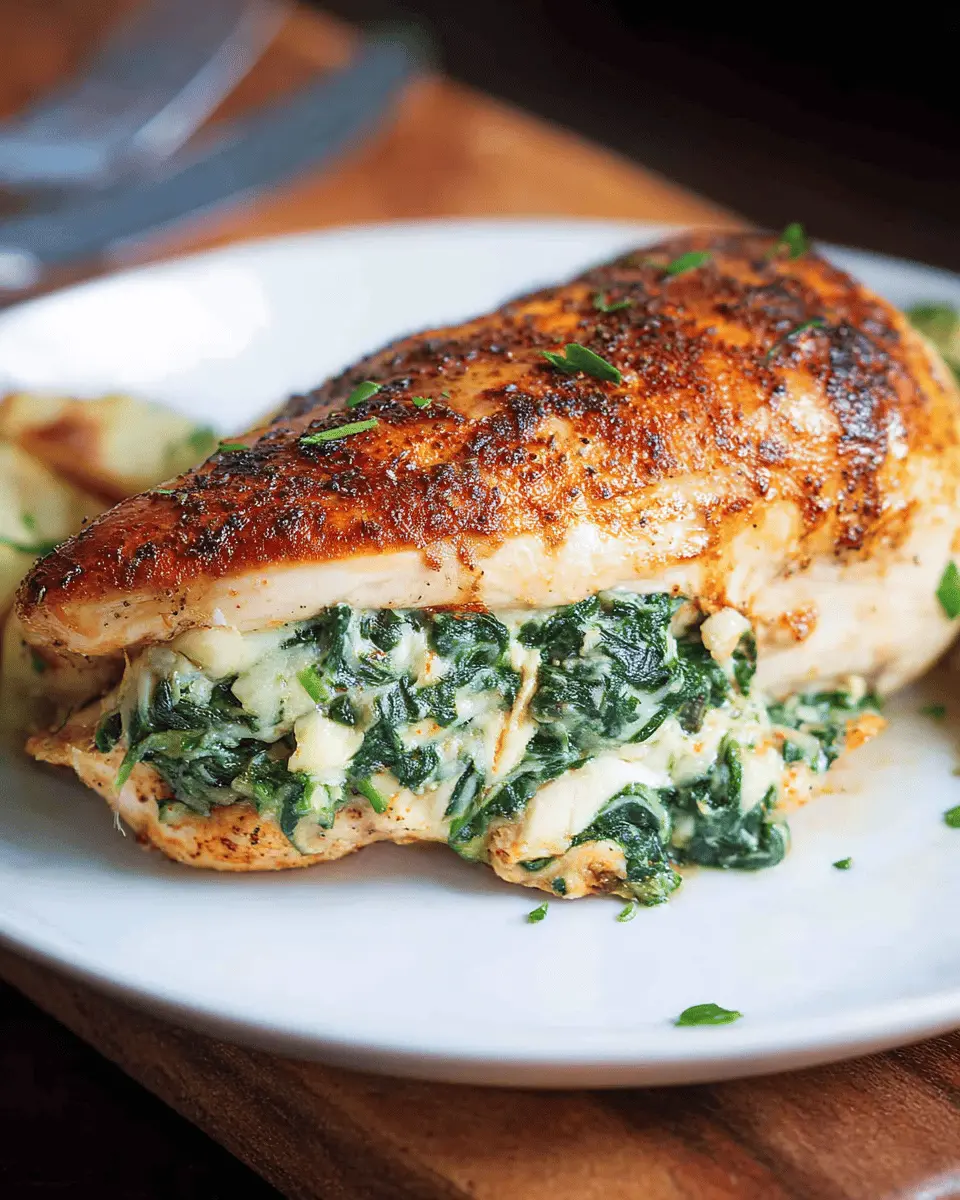 For a visually appealing presentation, slice the spinach stuffed chicken at an angle to reveal its colorful filling. Serve it on a bed of sautéed spinach or a smooth garlic purée to enhance its visual contrast. Garnish with fresh herbs like basil or parsley for that extra touch. This not only makes the meal look elegant but also elevates the overall dining experience.