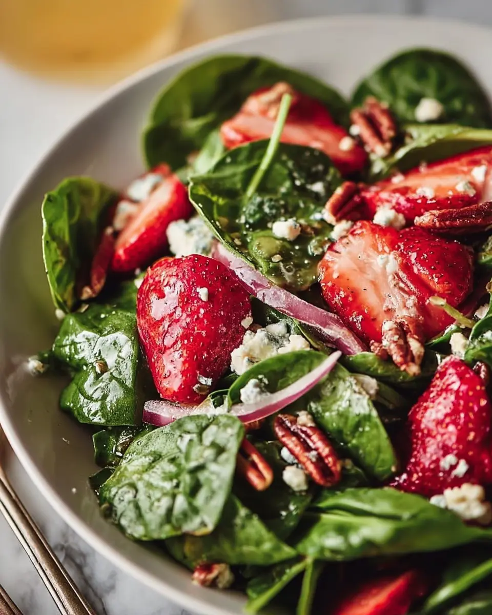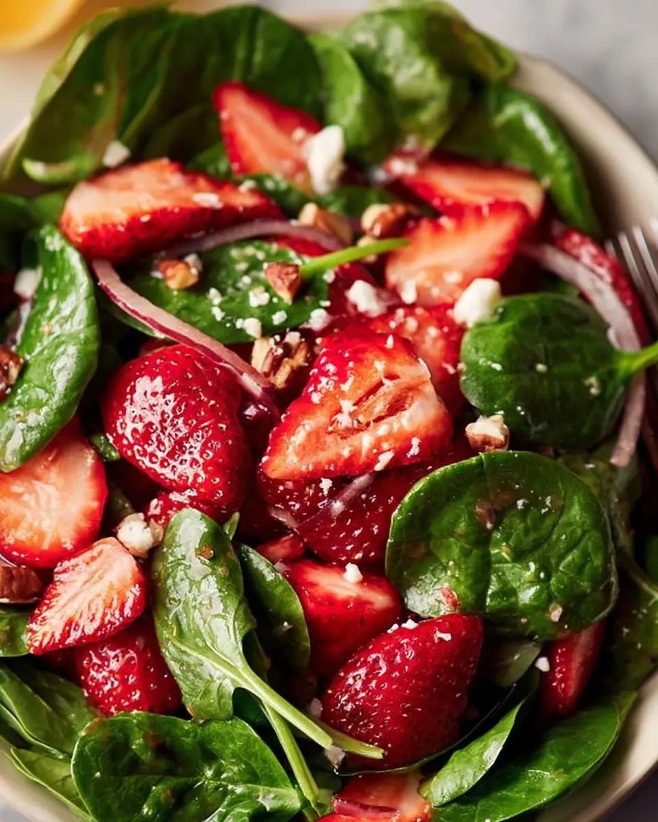 When selecting strawberries for your strawberry spinach salad, look for berries that are firm, plump, and deep red in color. Avoid those with green or white patches, as they’re not yet ripe. If you can, buy organic strawberries to maximize flavor and minimize pesticides. In season, strawberries are their sweetest, so consider checking your local farmer’s market for the freshest options.