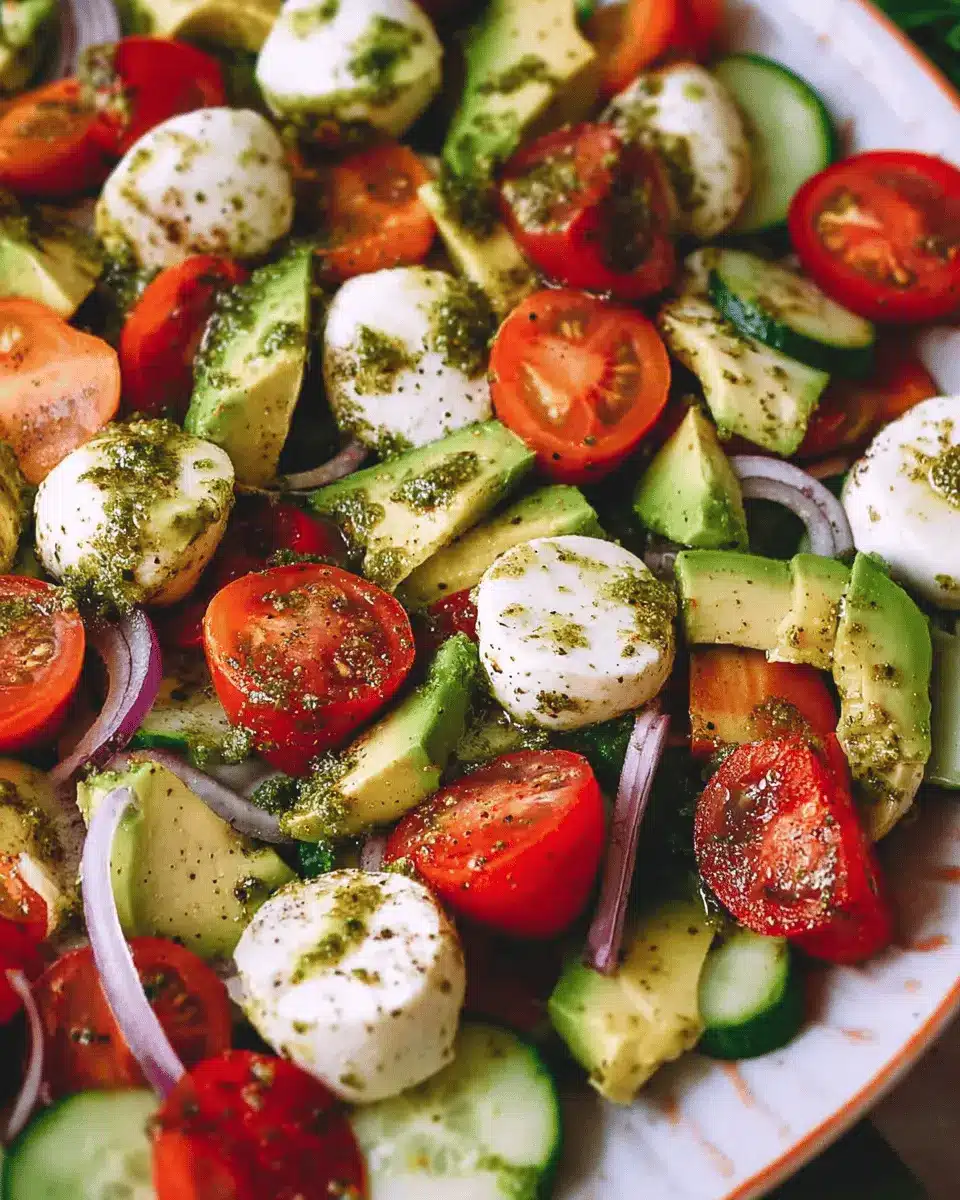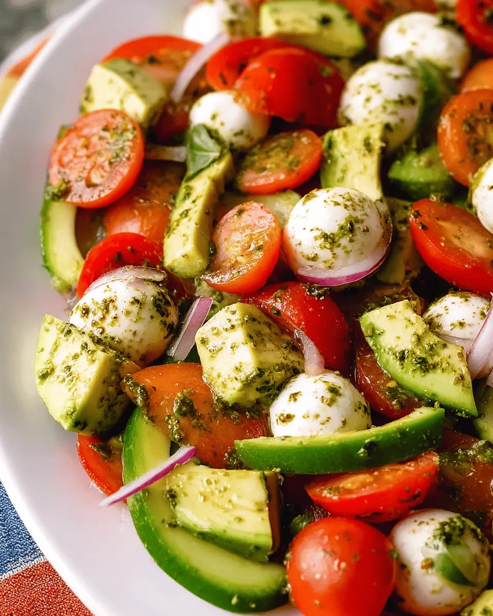 In summary, the Tomato Cucumber Avocado Salad with Mozzarella and Basil Pesto is not just a vibrant addition to your meals; it’s a powerhouse of flavors and nutrients. Ideal for all occasions, it's sure to impress friends and family alike. Enjoy crafting this refreshing dish!