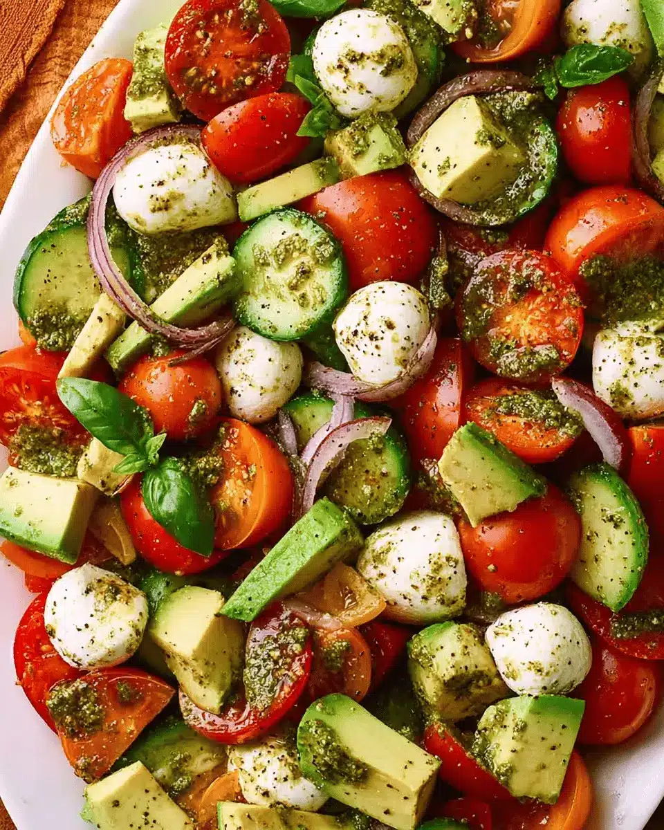 Tomato Cucumber Avocado Salad with Mozzarella and Basil Pesto